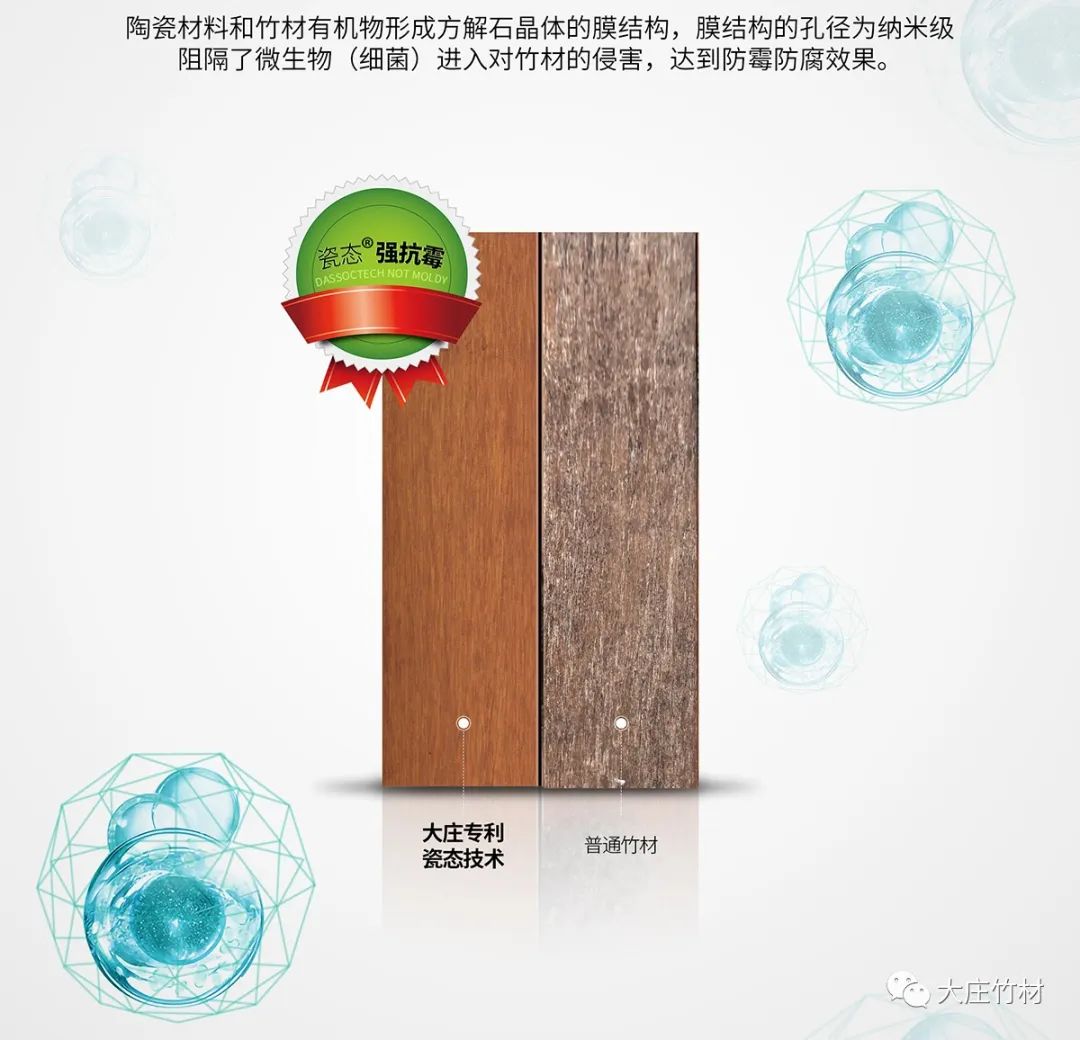 大庄“瓷态”既保持了竹材天然的颜色又达到了户外强抗霉、不易变形、绿色环保的要求,性能优越、坚实耐用。这是竹产业科技创新领域的再一次重大突破。