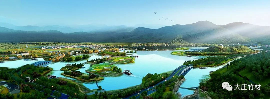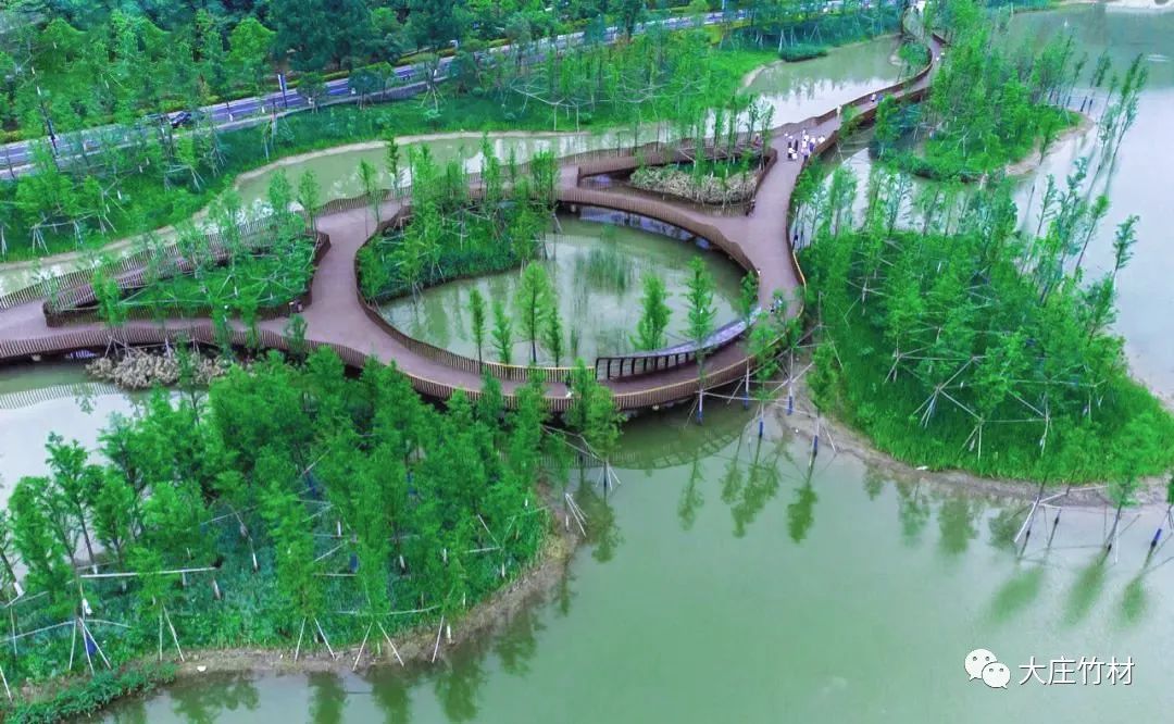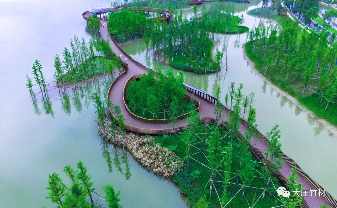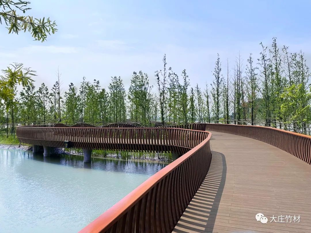 杉树的倒影在碧波中荡漾,光影如画,美不胜收。流线感极强的竹栈道,串联了蜿蜒交织的路径,建筑肌理与生态野趣相互交融,形成融入风景的云杉映波,在这里,与天空、花草树木不期而遇。